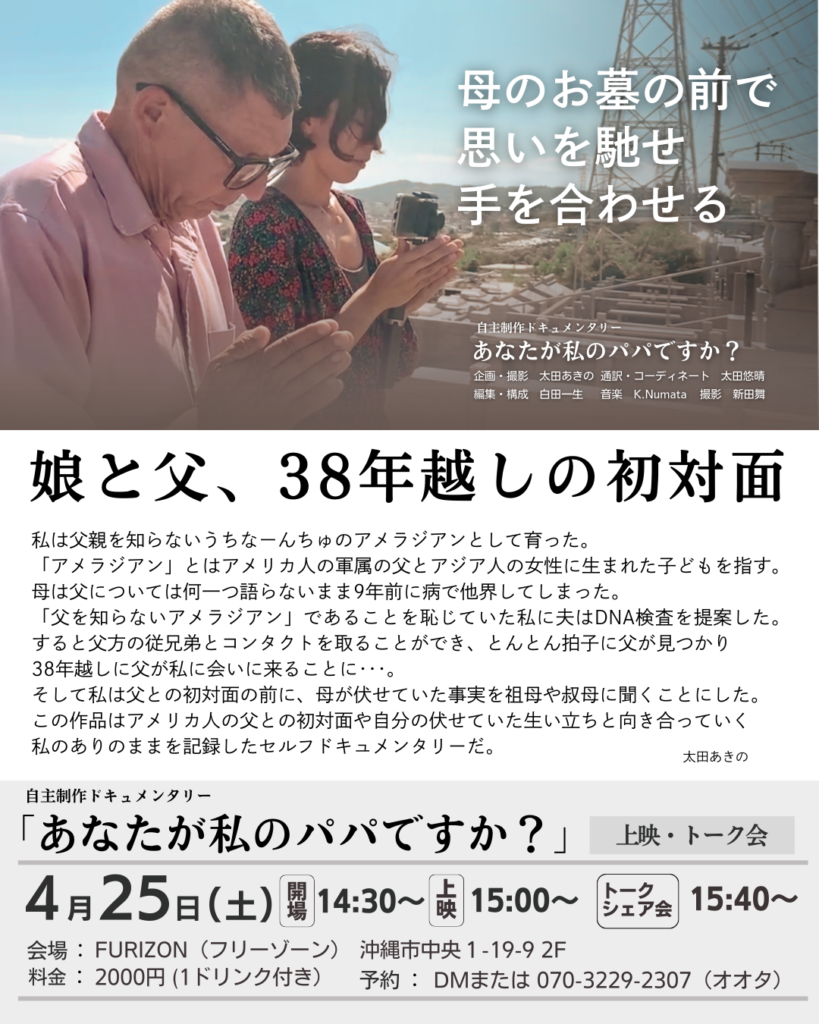「アメラジアン」とはアメリカ人の軍人の父とアジア人の女性の間に生まれた子どもを指す言葉。母は父については何一つ語らないまま9年前に病で他界しました。「父を知らないアメラジアンであること」を恥じていた私に、夫はDNA検査を提案してくれた。すると父方の従兄弟とコンタクトを取ることができ、とんとん拍子に父が見つかり…。アメリカ人の父との初対面や、自分の伏せていた生い立ちと向き合っていく様子を記録したセルフドキュメンタリーです。
