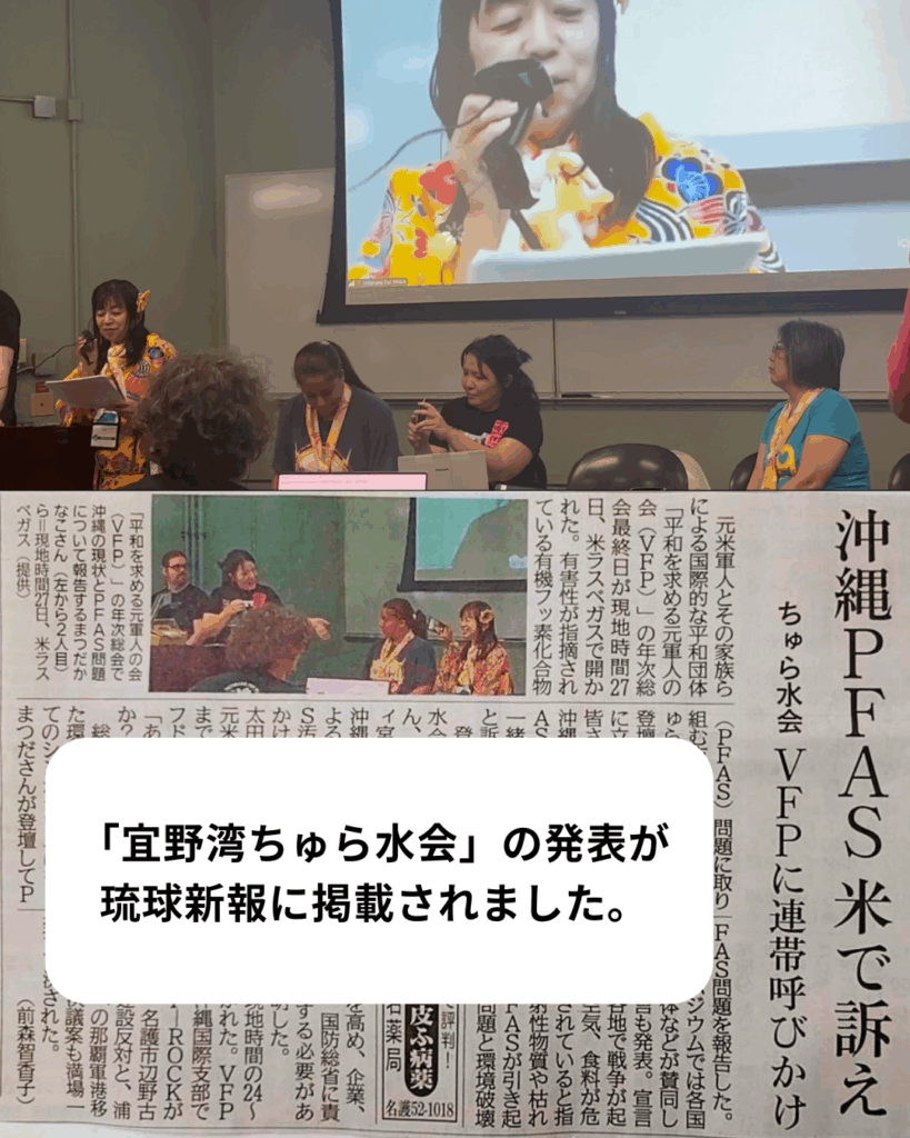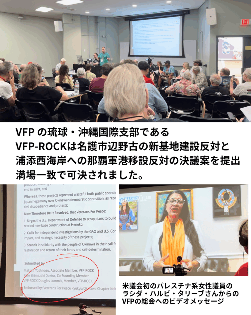 またVFP の琉球・沖縄国際支部であるVFP-ROCKは名護市辺野古の新基地建設反対と、浦添西海岸への那覇軍港移設反対の決議案を夫のキノコビーツとハワイから駆けつけてくれたピート・ドクトルさんが提出し、満場一致で可決されました。