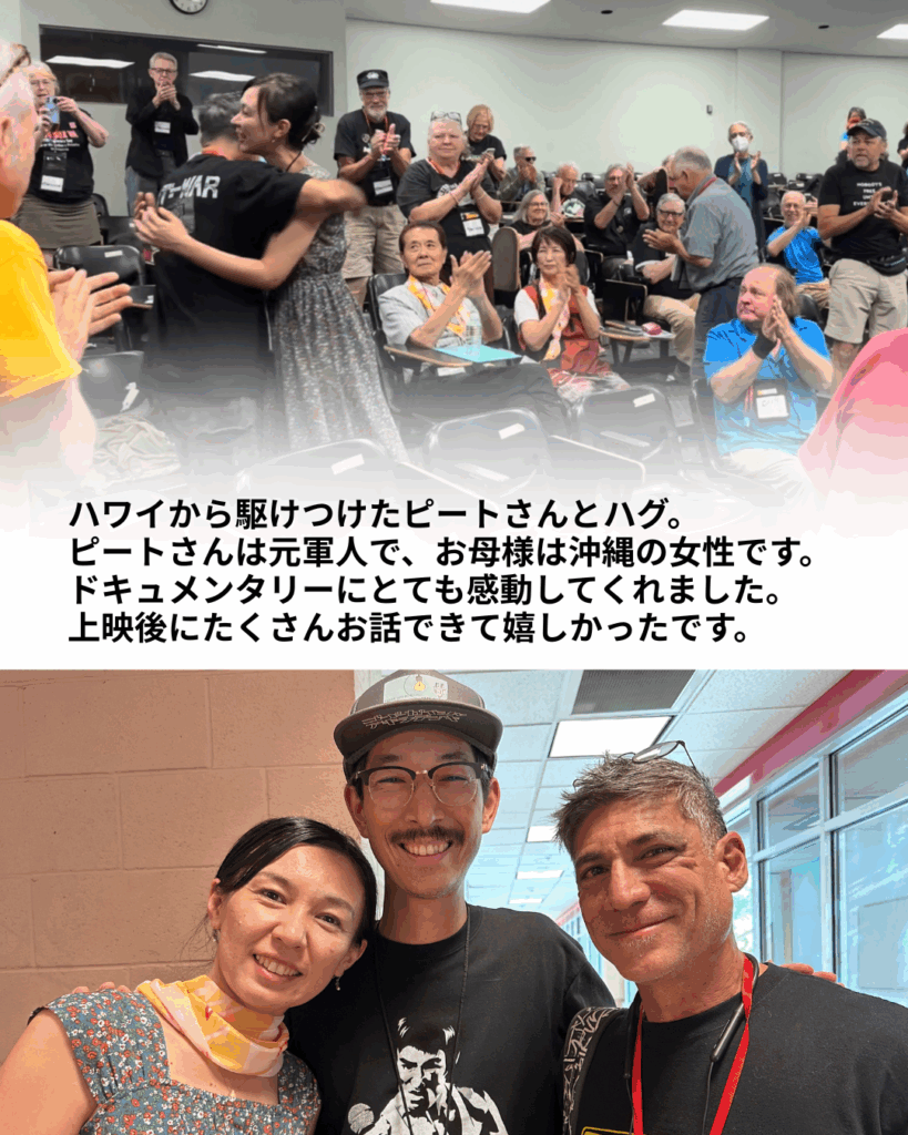 そのおかげでドキュメンタリーの上映は「宜野湾ちゅら水会」の登壇後となり結果的にとてもベストなタイミングになりました。有害性が指摘されている有機フッ素化合物(PFAS) 問題に取り組む市民団体「宜野湾ちゅら水会」のメンバーの、まつだかなこさん、宜野湾市議のプリティ宮城ちえさんが先住民族の女性権利の観点から琉球•沖縄の歴史や米軍基地による被害の現状、PFAS汚染問題へ連帯の呼びかけを行いました。参加者が沖縄に関心を持った直後のドキュメンタリー上映ということもあり拍手喝采のハグいっぱいの大成功になりました。感激で涙が溢れました。