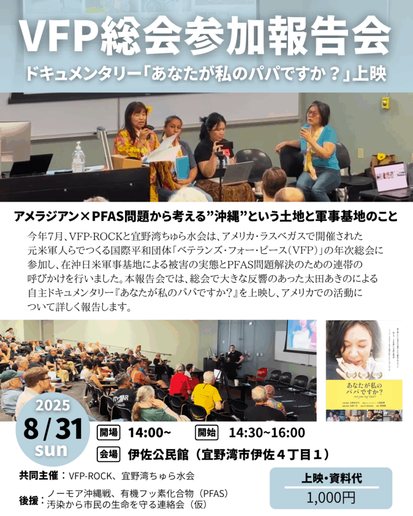 今年7月、VFP-ROCKと宜野湾ちゅら水会は、アメリカ・ラスベガスで開催された元米軍人らでつくる国際平和団体「ベテランズ・フォー・ピース(VFP)」の年次総会に参加し、在沖日米軍事基地による被害の実態とPFAS問題解決のための連帯の呼びかけを行いました。本報告会では、総会で大きな反響のあった太田あきのによる自主ドキュメンタリー『あなたが私のパパですか?』を上映し、アメリカでの活動について詳しく報告します。